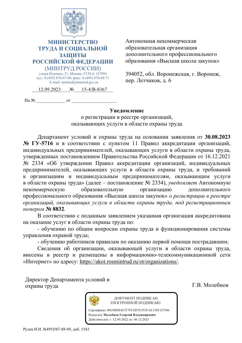 Выдана Министерством образования Воронежской области