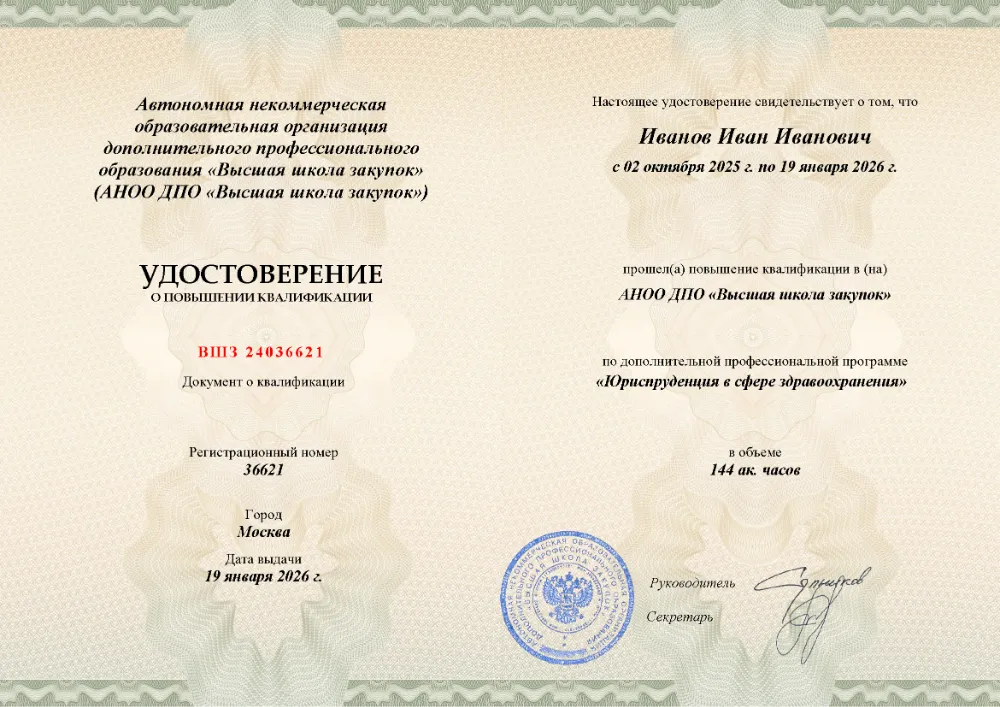 Повышение квалификации, 144 академических часа, 12 модулей: основы государственного, гражданского и административного права, трудовое и налоговое право, правовые основы охраны здоровья, права граждан и медицинских работников, юридическая ответственность в медицине. Онлайн-обучение в Москве с итоговой аттестацией.