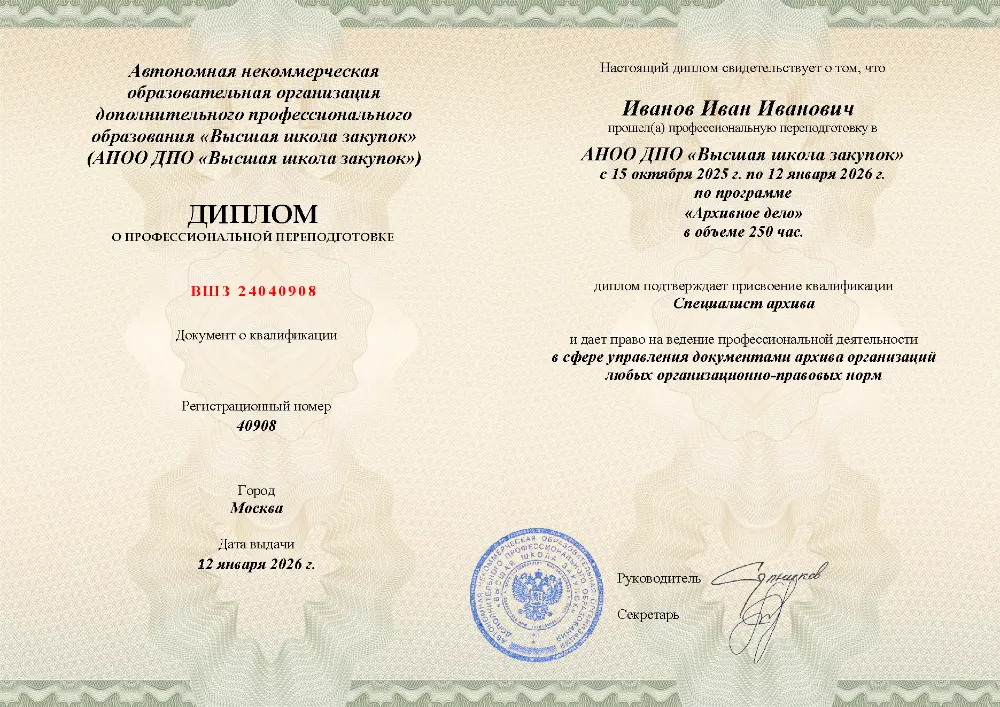 Программа профессиональной переподготовки (250 часов) для специалистов по архивному делу. Освойте правовые основы управления документами, технологии делопроизводства, оцифровку и организацию работы электронного архива с экспертизой ценности документов. Онлайн-обучение в Москве с итоговой аттестацией.