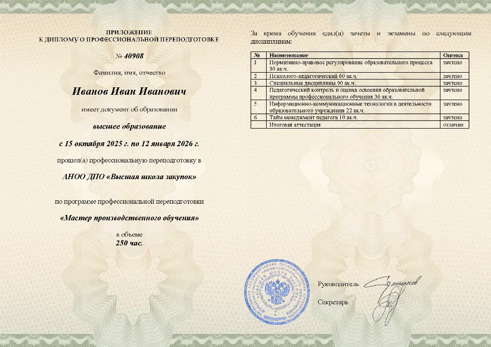Профессиональная переподготовка, 250 академических часов, 11 модулей: нормативно-правовое обеспечение, основы педагогики и психологии, проектирование образовательных программ, методика профессионального обучения, педагогический контроль, применение ИКТ и тайм-менеджмент педагога. Онлайн-обучение в Москве с итоговой аттестацией.