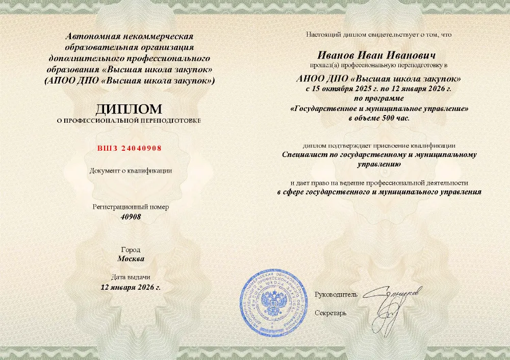 Профессиональная переподготовка, 500 академических часов, 25 модулей: правовые основы и система государственного управления, управление персоналом, финансами и противодействие коррупции, социальная политика и экономическое регулирование, цифровизация, закупки и информационная безопасность. Онлайн-обучение в Москве с итоговой аттестацией.