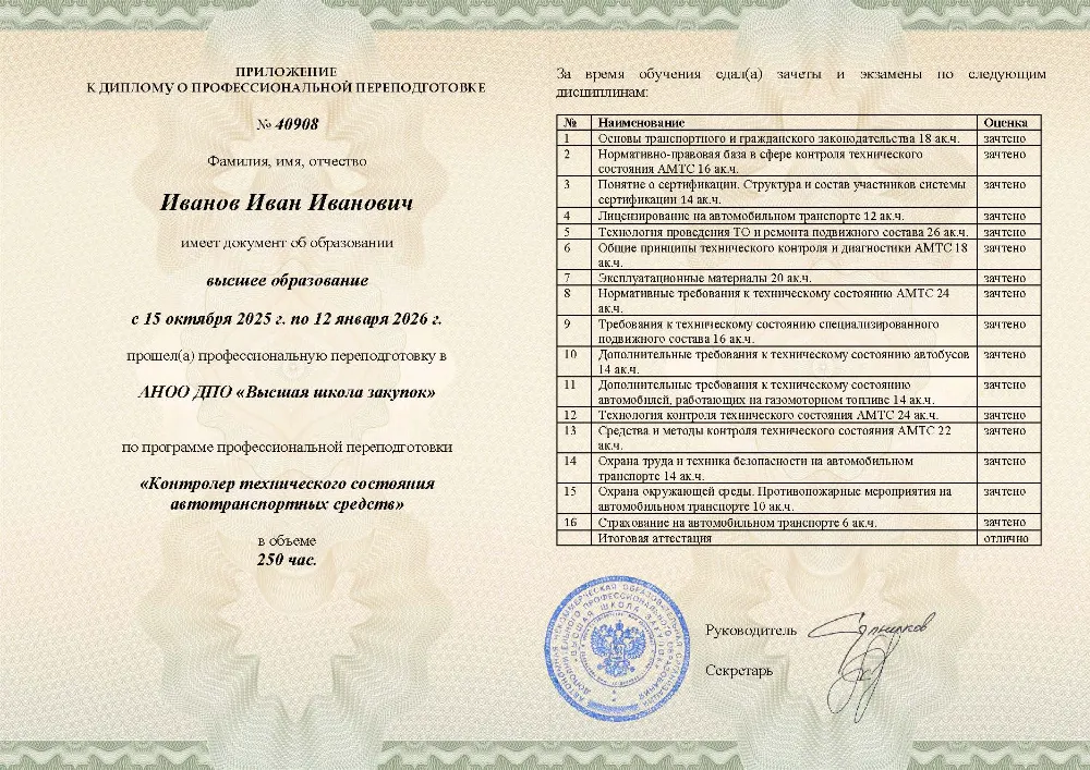 Профессиональная переподготовка, 250 академических часов, 7 модуля: нормативно-правовые основы и технологии контроля, охрана труда, экологии и требования к техническому состоянию транспортных средств. Онлайн-обучение в Москве с итоговой аттестацией.